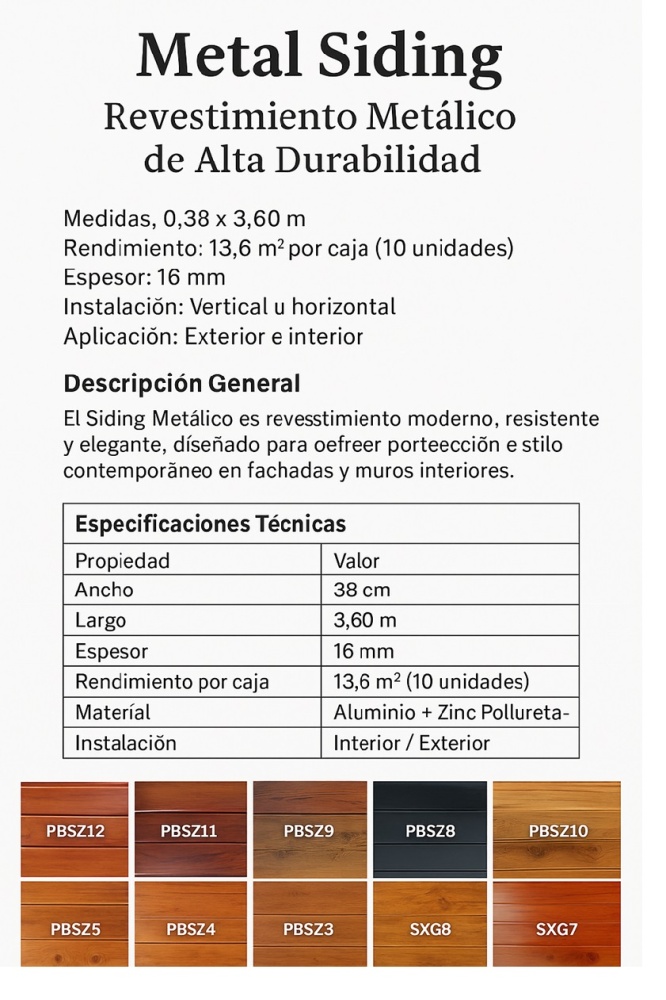 El Siding Metálico es un revestimiento moderno, resistente y elegante, diseñado para ofrecer protección duradera y estilo contemporáneo en fachadas y muros interiores. Fabricado con materiales de alta calidad, combina resistencia estructural, eficiencia térmica y aislamiento acústico, logrando un acabado estético de primer nivel y un mantenimiento mínimo.